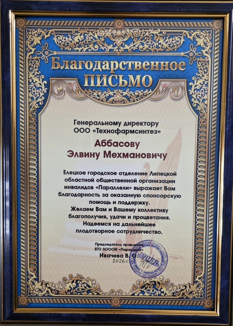 Сегодня мы получили благодарственное письмо от Елецкого городского отделения Липецкой областной общественной организации инвалидов «Параллели» за оказанную спонсорскую помощь и поддержку.