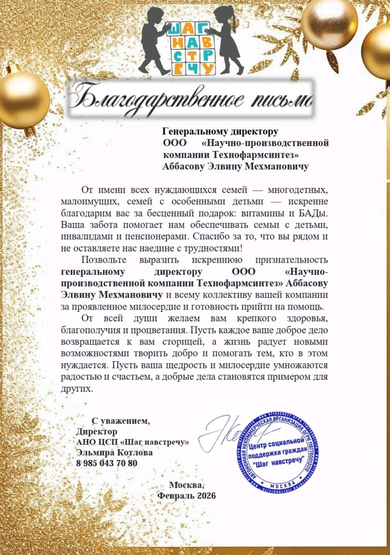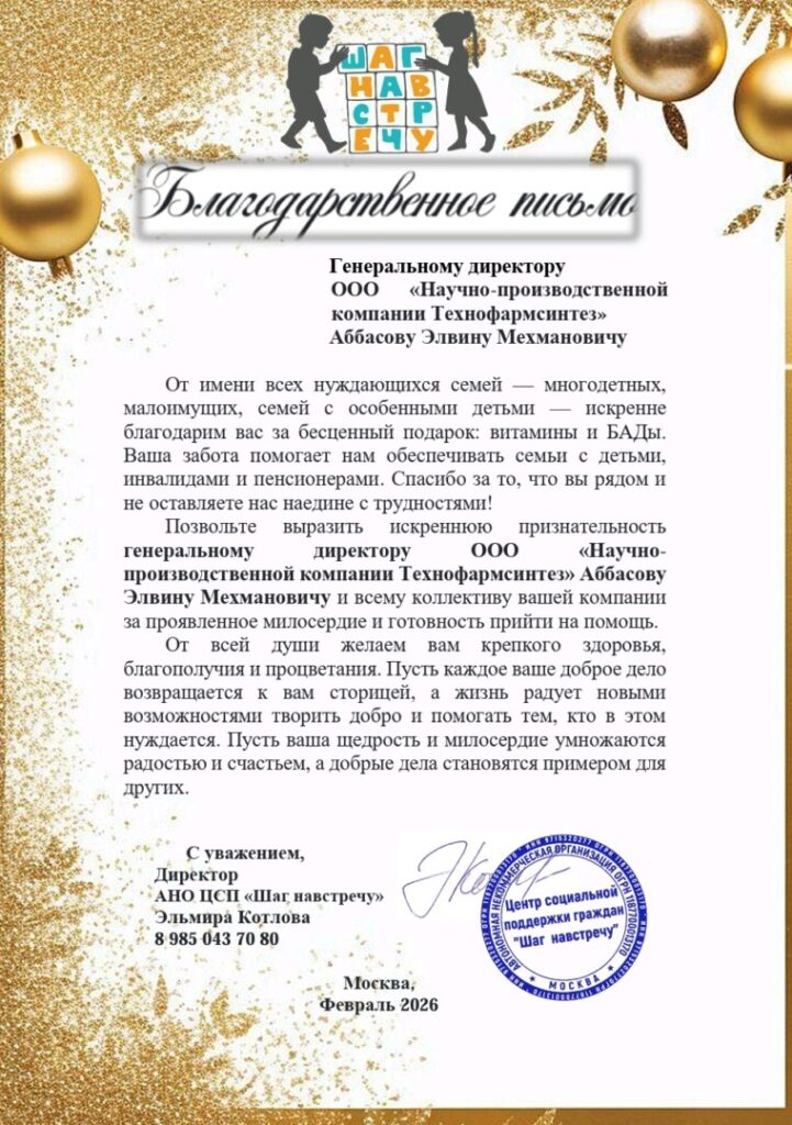 Мы передали витамины и биологически активные добавки многодетным и малоимущим семьям, а также семьям, воспитывающим детей с особыми потребностями.