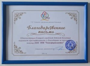 Сегодня НПК ТЕХНОФАРМСИНТЕЗ оказала благотворительную помощь ГУЗ «Елецкая городская детская больница».