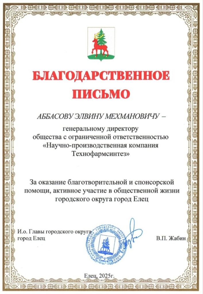 Сегодня НПК ТЕХНОФАРМСИНТЕЗ оказывает благотворительную помощь нашему родному городу Ельцу! Мы…