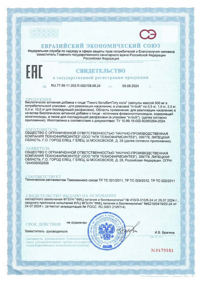 Состав: молотые листья гингко билоба - 223 мг., экстракт готу колы - 223 мг. Оболочка капсулы - желатин. Общий вес капсулы - 500 мг. Капсула прозрачная, без диоксида титана. Размер капсулы - #0.