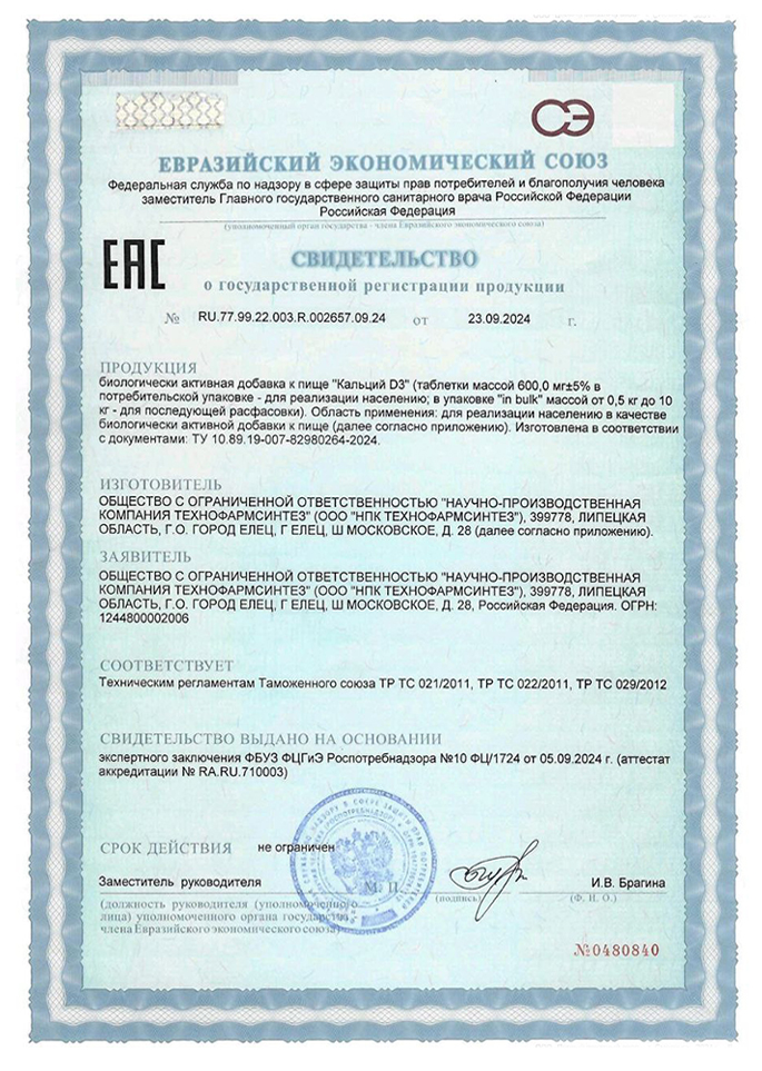 Состав: кальций цитрат - 420 мг., витамин D3 - 3 мг. Масса таблетки - 600 мг.
