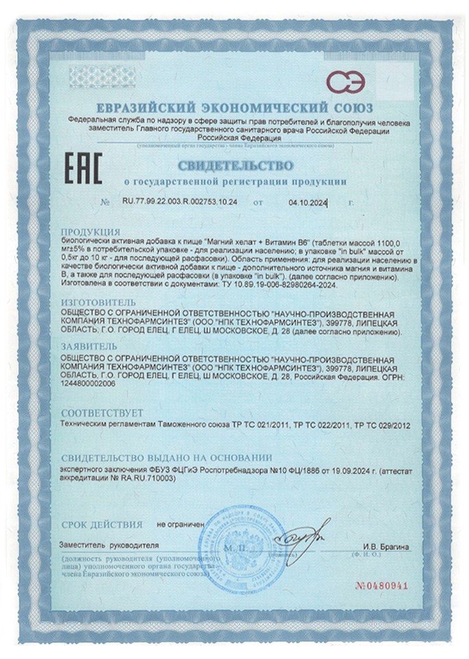 Состав: магний хелат (в т.ч. элементарный магний) - 1000 мг., витамин В6 - 2 мг. Масса таблетки - 1100 мг.