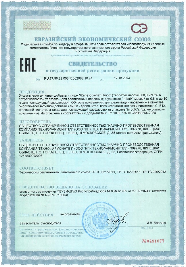 Состав: железо - 20 мг., витамин С (аскорбиновая кислота) - 50 мг., витамин В9 (фолиевая кислота) - 0.3 мг., витамин В12 (цианокобаламин) - 0.0045 мг. Масса таблетки - 600 мг.