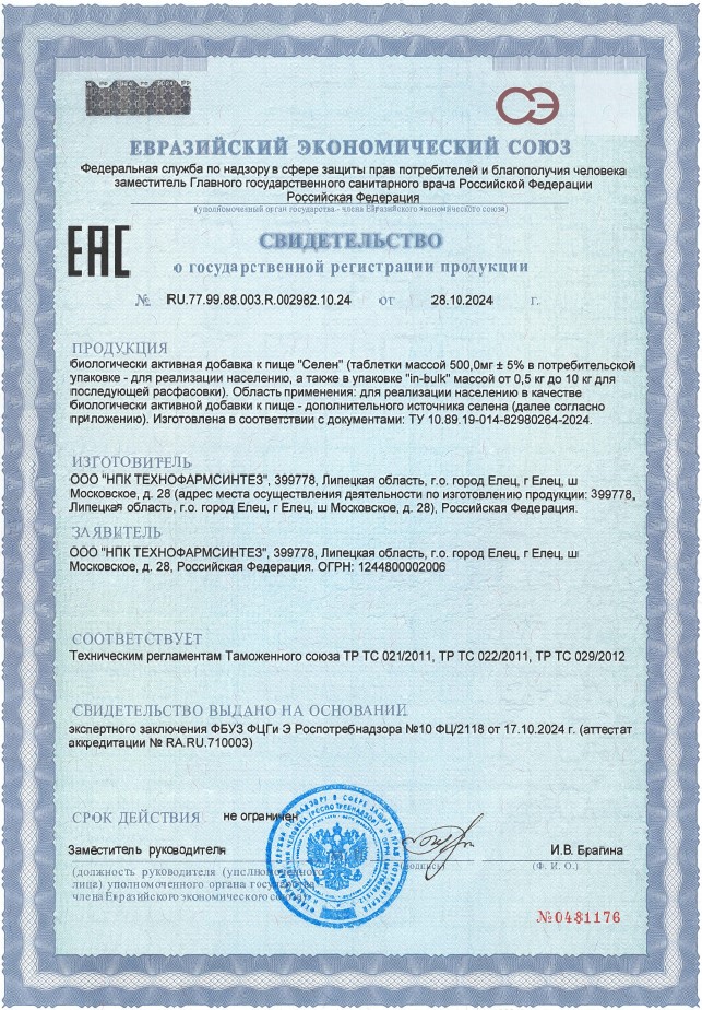 Состав: Селен - 150 мкг. Масса таблетки - 500 мг.