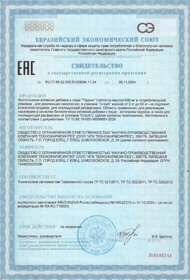 Состав: Таурин - 500мг. Масса таблетки - 600 мг.