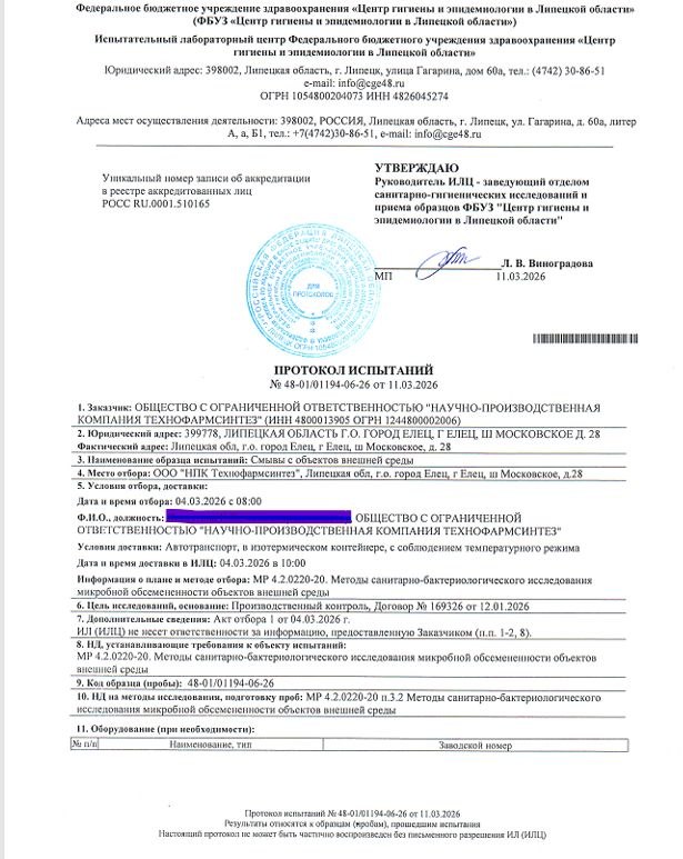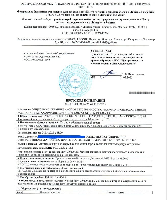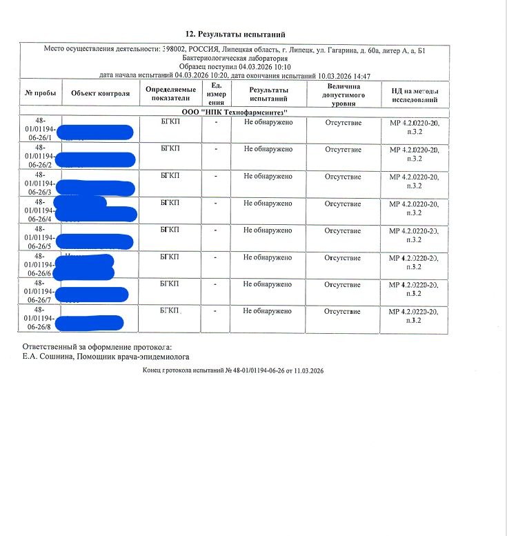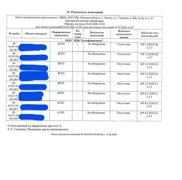 Сегодня наша компания получила результаты экспертиз и лабораторных исследований смывов с производственного оборудования и окружающей среды (от 11.03.2026г.) из Федерального бюджетного учреждения здравоохранения «Центр Гигиены и эпидемиологии в Липецкой области» (г. Липецк). Как и всегда, результаты показали абсолютное соответствие всем установленным нормам и стандартам!