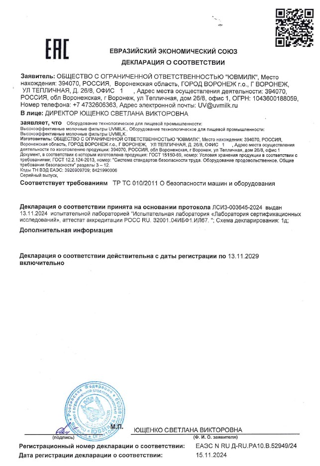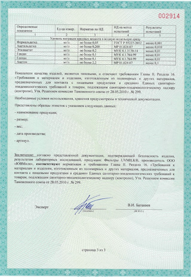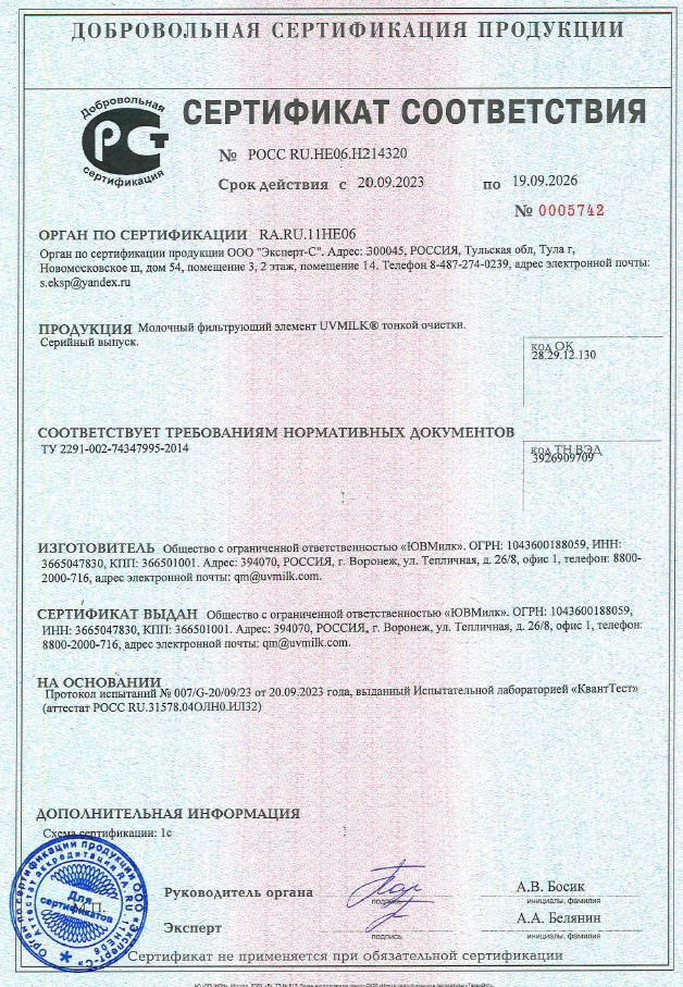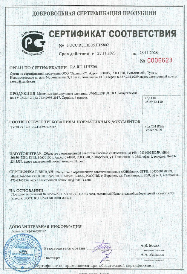 Сертификат № РОСС RU.HЕ06.H15802 от 27.11.2023 (фильтрующие элементы UVMILK® ULTRA)