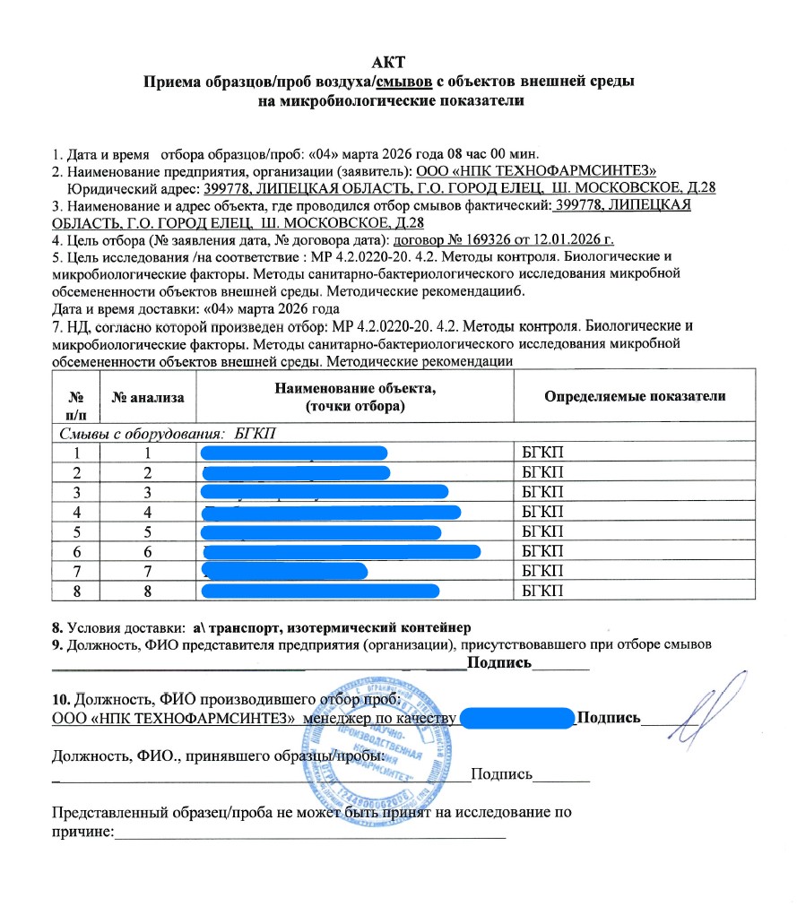Очередная отправка смывов с производственного оборудования на экспертизу безопасности от 04.03.2026г.