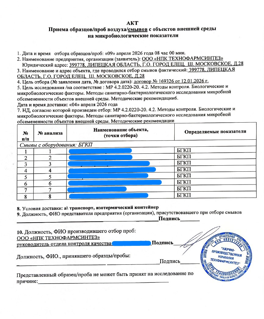 Очередная отправка смывов с производственного оборудования на экспертизу безопасности от 09.04.2026г.
