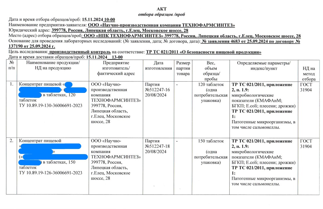 Очередные образцы (в кол-ве 11 шт.) отправились на лабораторные испытания и экспертизу безопасности в Федеральное бюджетное учреждение здравоохранения «Центр Гигиены и эпидемиологии в Липецкой области» в г. Липецк