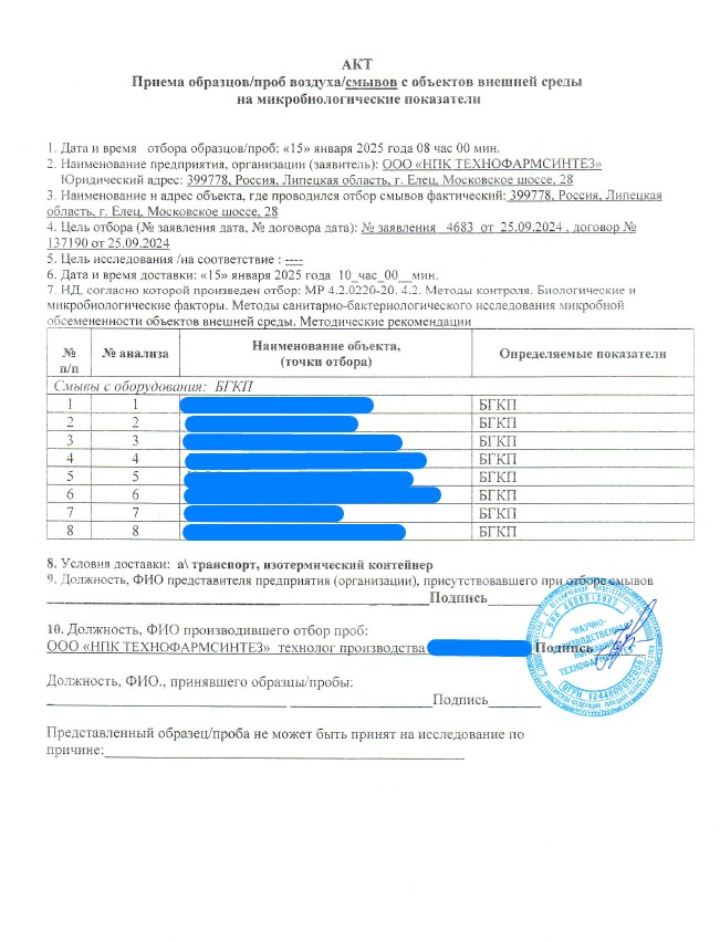 Отправка смывов с произв. оборудования на экспертизу безопасности 14.01.2025г.