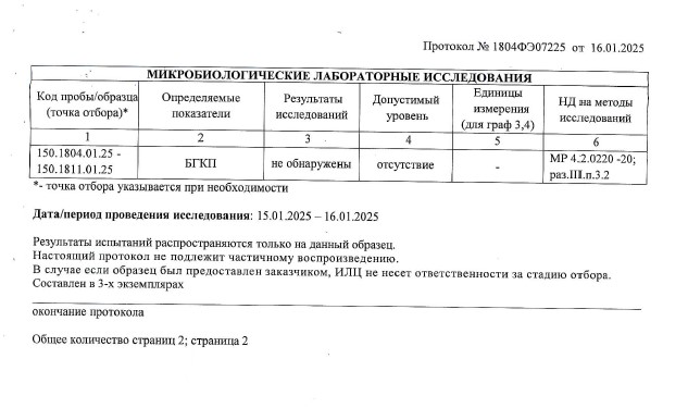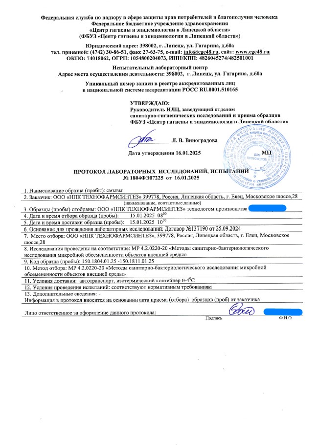 Сегодня наша компания получила результаты экспертиз и лабораторных исследований смывов с производственного оборудования из Федерального бюджетного учреждения здравоохранения «Центр Гигиены и эпидемиологии в Липецкой области» (г. Липецк). Как и всегда, результаты показали абсолютное соответствие всем установленным нормам и стандартам!