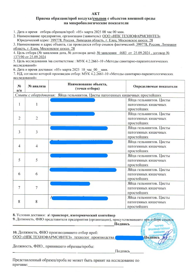 Отправка смывов с произв. оборудования на экспертизу безопасности 5.03.2025г.