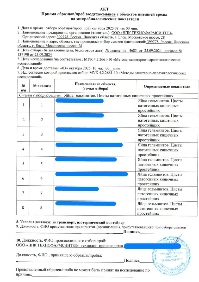 Отправка смывов с произв. оборудования на экспертизу безопасности от 03.10.2025г.