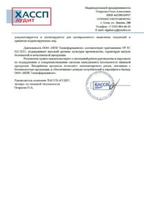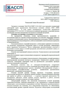 Мы благодарим экспертов ХАССП-АУДИТ за проведённую работу, профессиональную оценку и высокую отметку деятельности предприятия!