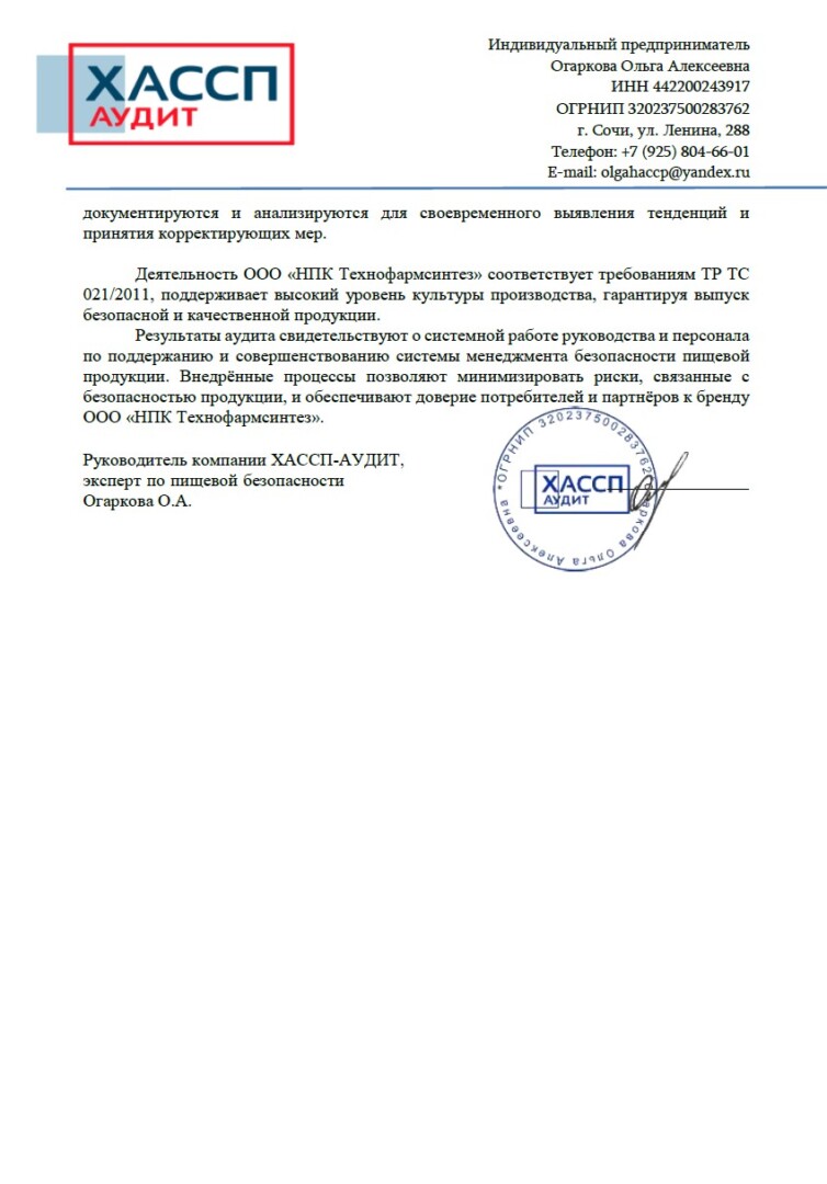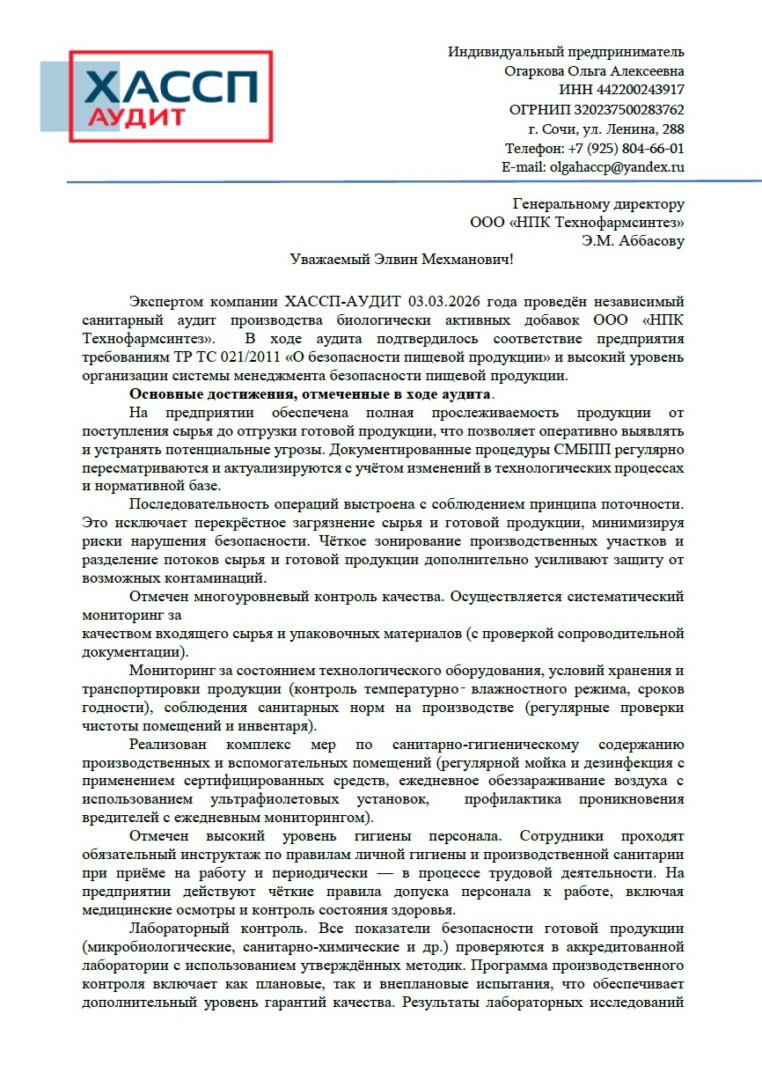 03.03.2026 НАУЧНО-ПРОИЗВОДСТВЕННАЯ КОМПАНИЯ ТЕХНОФАРМСИНТЕЗ успешно прошла очередной независимый аудит экспертов ХАССП-АУДИТ