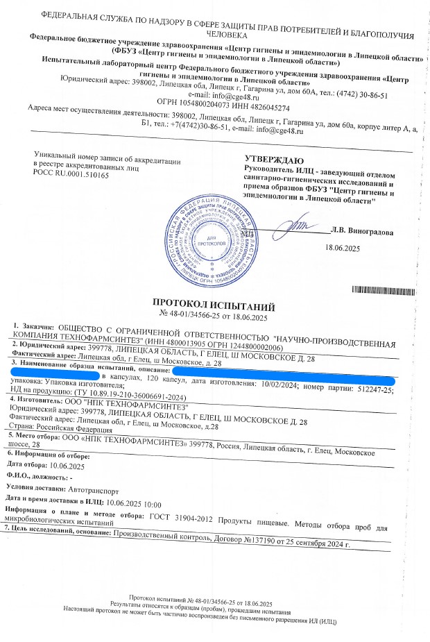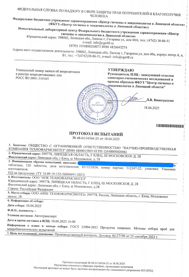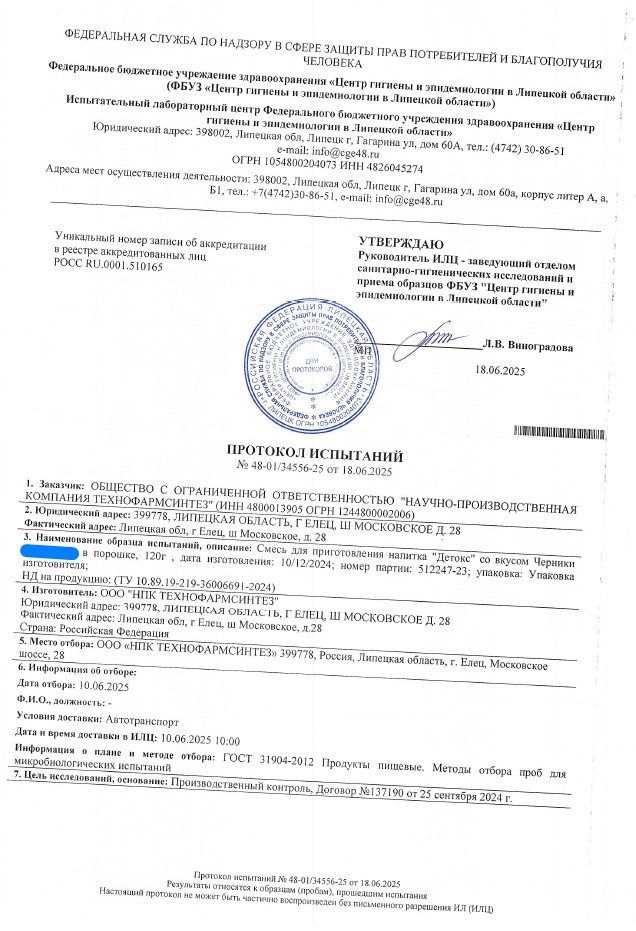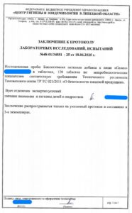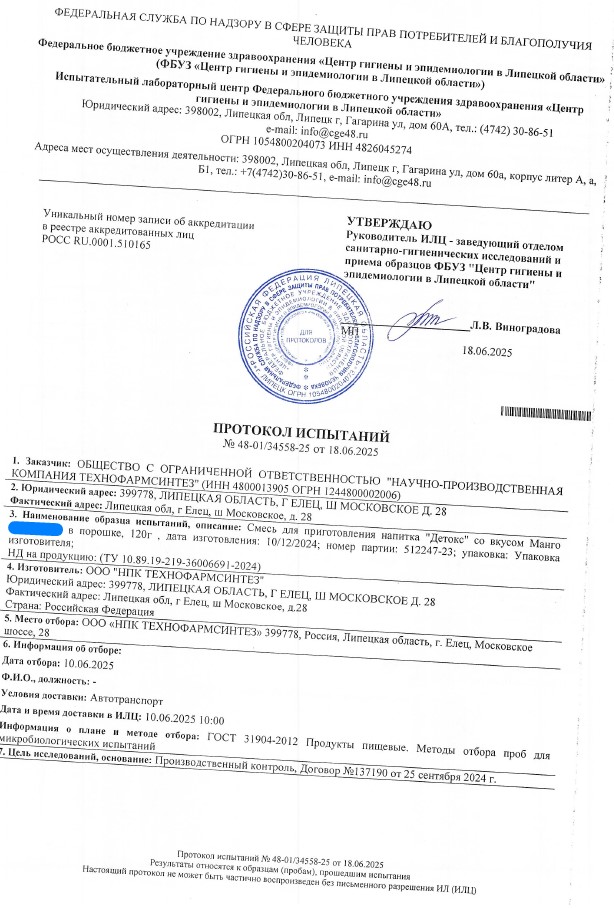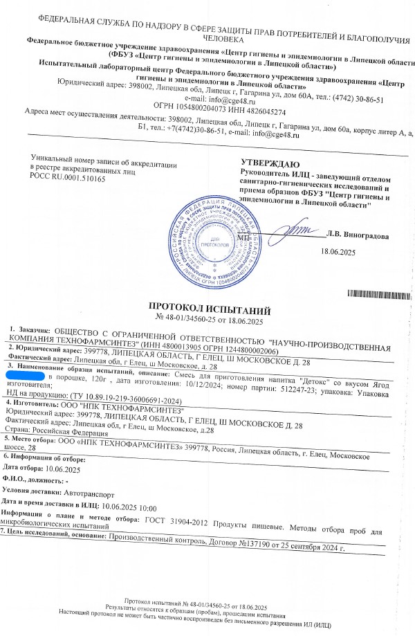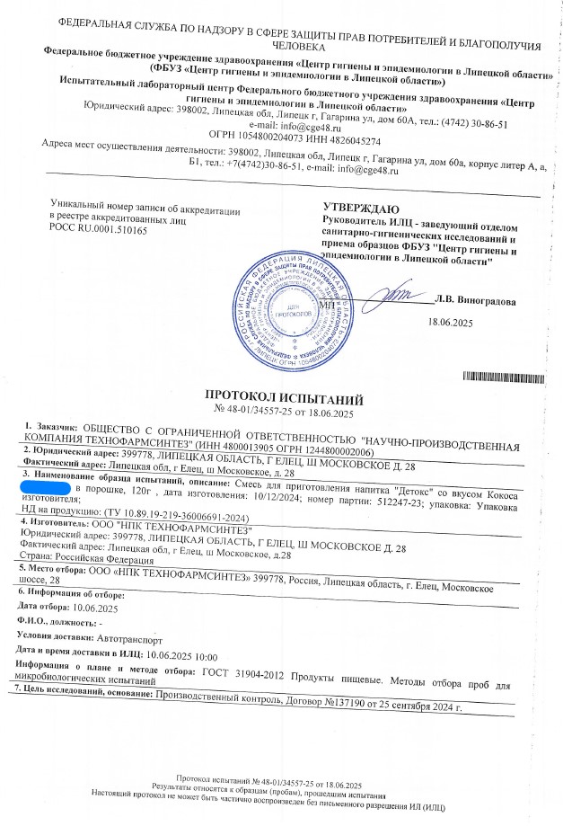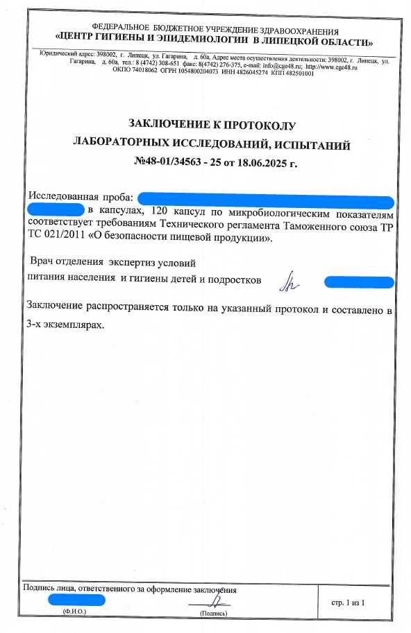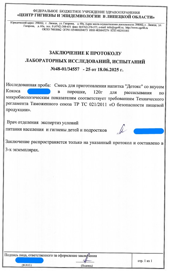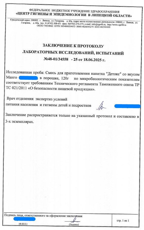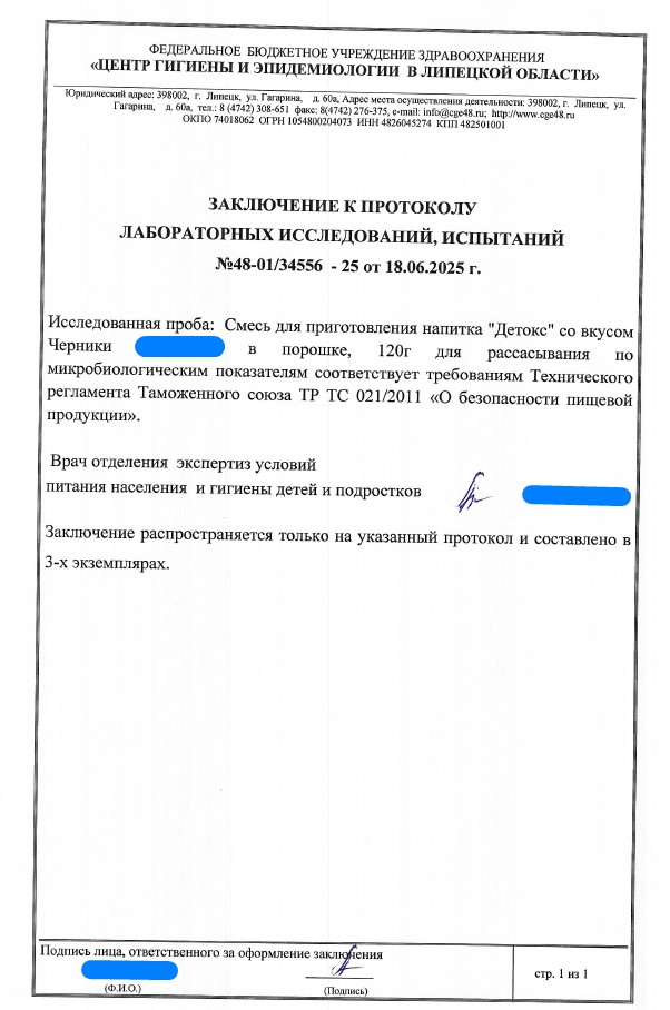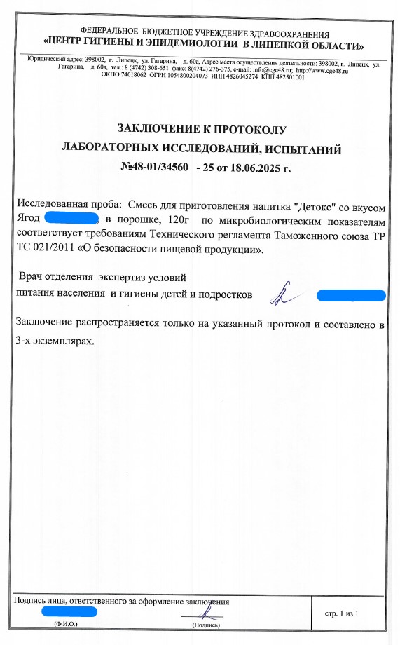 Сегодня, в очередной раз, мы с гордостью делимся свежими результатами экспертизы безопасности нашей продукции от 18.06.2025г. Управление Федеральной службы по надзору в сфере защиты прав потребителей и благополучия человека по Липецкой области в г. Липецк подтвердило: абсолютно вся наша продукция (пищевые концентраты, БАД к пище, а так-же наша новая линейка водорастворимых, витаминизированных детокс-напитков) полностью соответствует всем строгим требованиям безопасности!