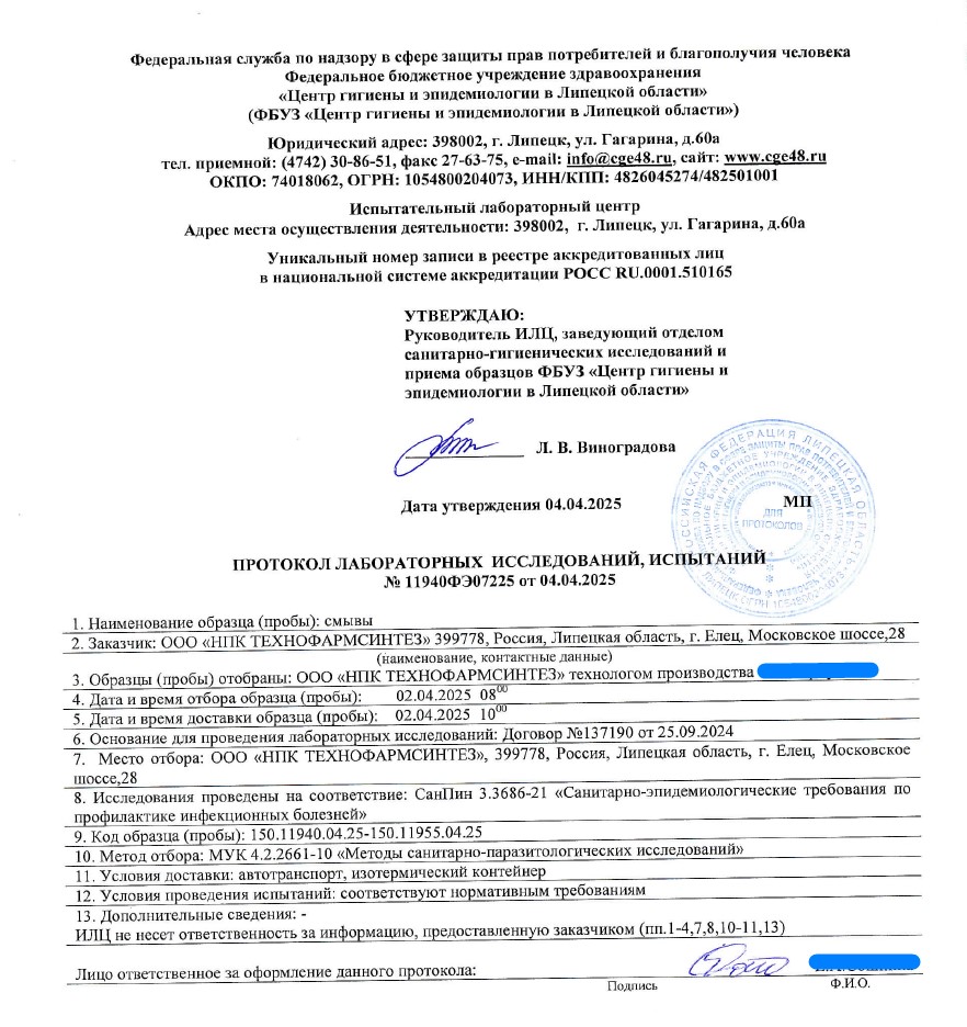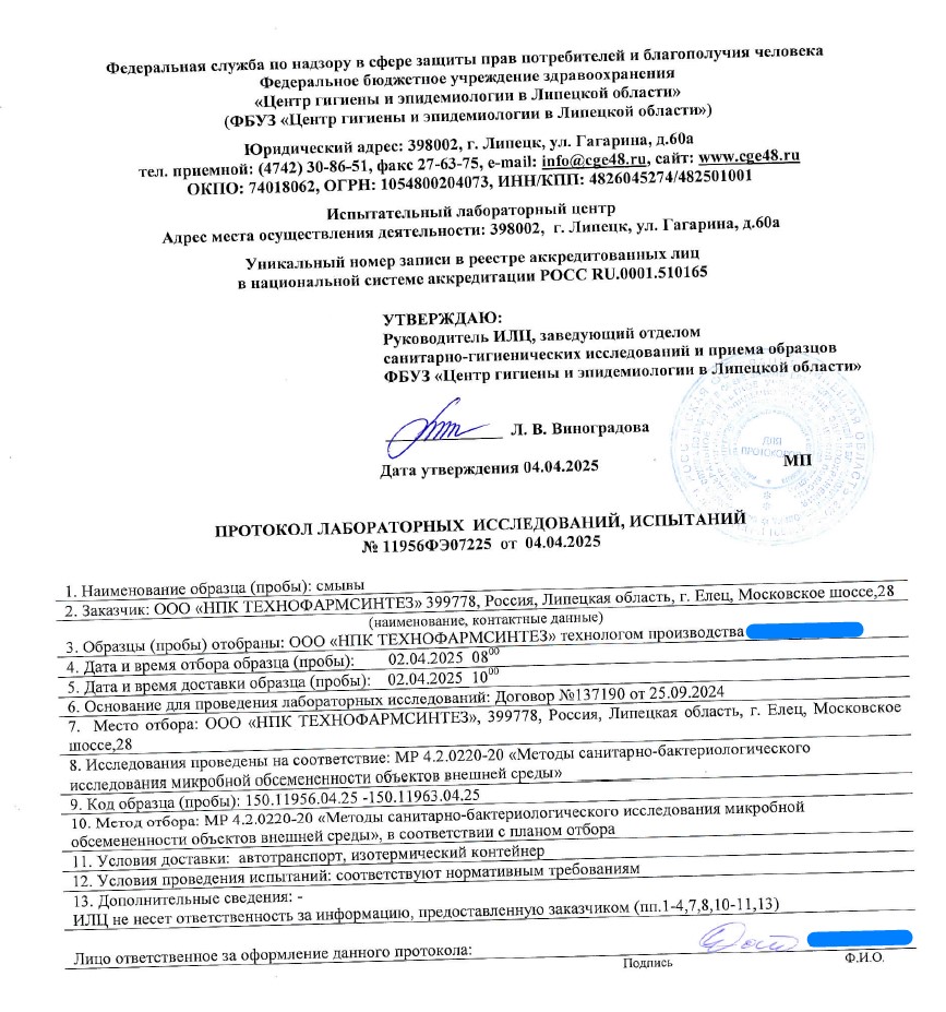 Сегодня наша компания получила результаты экспертиз и лабораторных исследований смывов с производственного оборудования (от 04.04.2025г.) из Федерального бюджетного учреждения здравоохранения «Центр Гигиены и эпидемиологии в Липецкой области» (г. Липецк). Как и всегда, результаты показали абсолютное соответствие всем установленным нормам и стандартам!