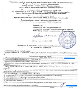 Сегодня наша компания получила результаты экспертиз и лабораторных исследований смывов с производственного оборудования (от 30.04.2025 и 05.05.2025г.) из Федерального бюджетного учреждения здравоохранения «Центр Гигиены и эпидемиологии в Липецкой области» (г. Липецк). Как и всегда, результаты показали абсолютное соответствие всем установленным нормам и стандартам!