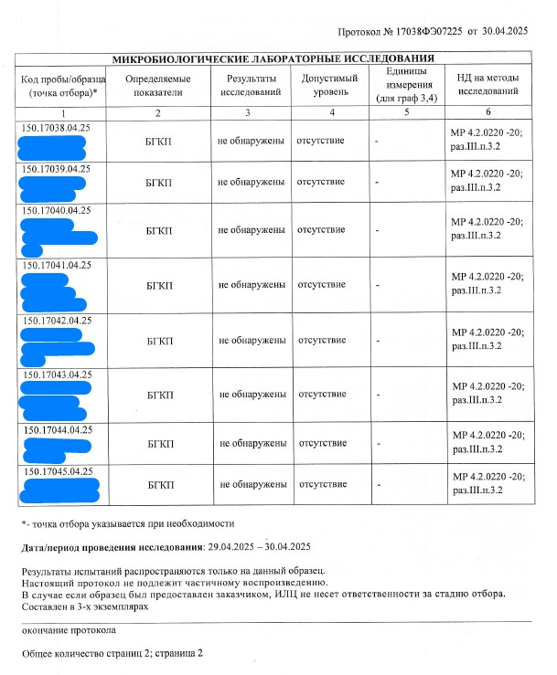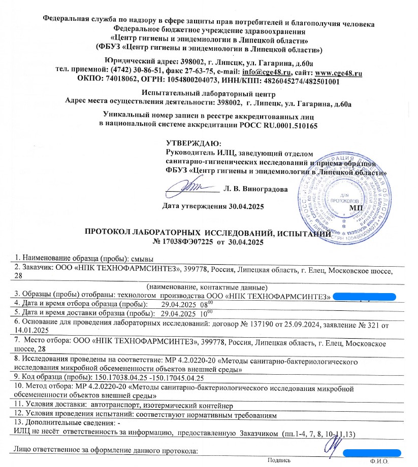 Сегодня наша компания получила результаты экспертиз и лабораторных исследований смывов с производственного оборудования (от 30.04.2025 и 05.05.2025г.) из Федерального бюджетного учреждения здравоохранения «Центр Гигиены и эпидемиологии в Липецкой области» (г. Липецк). Как и всегда, результаты показали абсолютное соответствие всем установленным нормам и стандартам!
