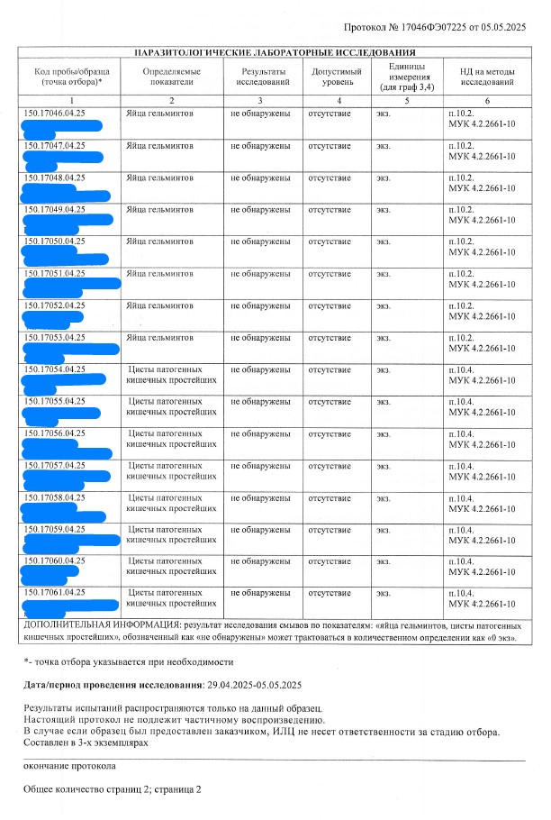 Результаты экспертиз безопасности смывов с произв. оборудования от 30.04.2025 и 05.05.2025г.