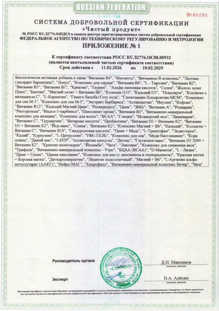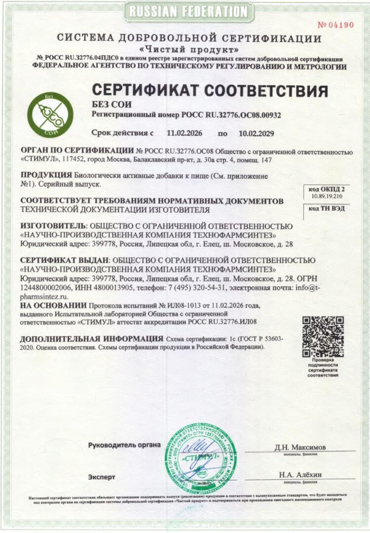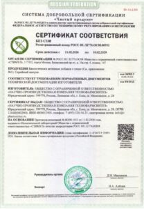 Сертификат выдан на серийный выпуск биологически активных добавок и подтверждает соответствие продукции требованиям технической документации изготовителя.
