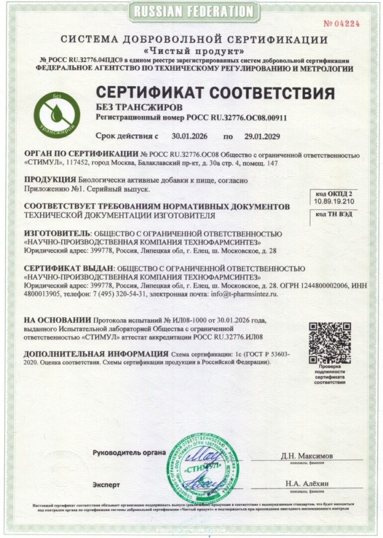Сертификат соответствия требованиям «Без трансжиров» (Чистый продукт)