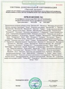 Сертификат выдан на серийный выпуск биологически активных добавок и подтверждает, что наша продукция: