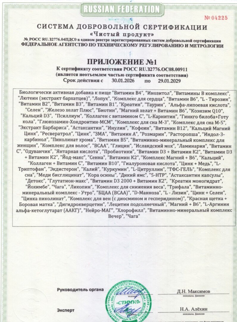 Отдельно важно: в приложение к сертификату включён широкий перечень продукции — от витаминно-минеральных комплексов и аминокислот до экстрактов, пробиотиков и специализированных формул. Контроль и требования распространяются не на один продукт, а на систему в целом.