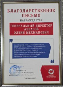Благодарственное письмо от «Российской Партии Пенсионеров за социальную справедливость»