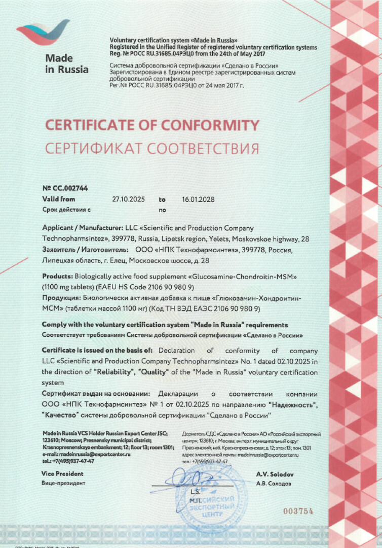 Этот документ подтверждает, что продукция НПК ТЕХНОФАРМСИНТЕЗ отвечает требованиям национальной системы добровольной сертификации «Сделано в России» и соответствует высочайшим стандартам качества, надёжности и безопасности! Первым продуктом, прошедшим сертификацию, стал «Глюкозамин-Хондроитин-МСМ» — биологически активная добавка, разработанная нашими специалистами для поддержания здоровья суставов и опорно-двигательного аппарата.
