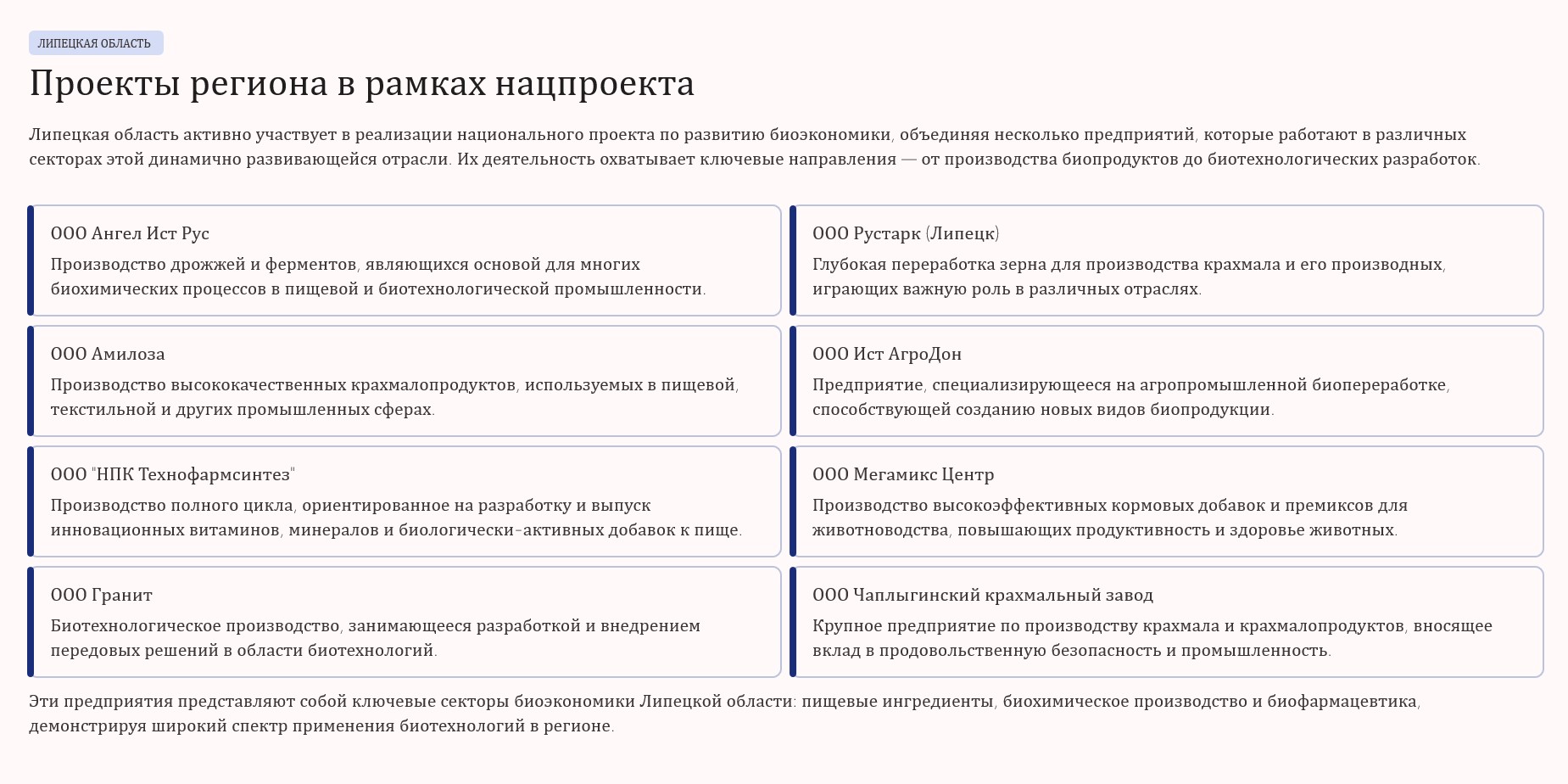 Для нашей компании участие в национальном проекте — это ответственная миссия, связанная с вкладом в развитие стратегически важной отрасли, напрямую влияющей на здоровье граждан, продовольственную безопасность и научно-технологическое будущее страны.
