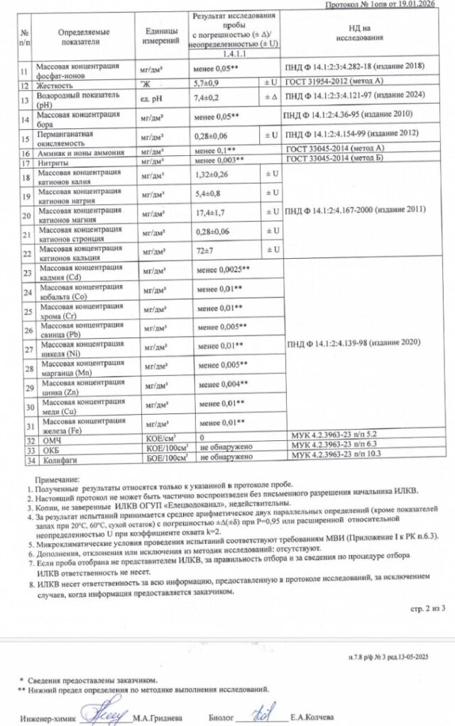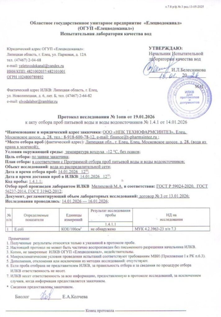 Испытания выполнены аккредитованной лабораторией ОГУП «Елецводоканал» по действующим ГОСТ, санитарным правилам и методикам, применяемым на федеральном уровне. Проверка охватила полный спектр показателей: органолептические, физико-химические, микробиологические и токсикологические.