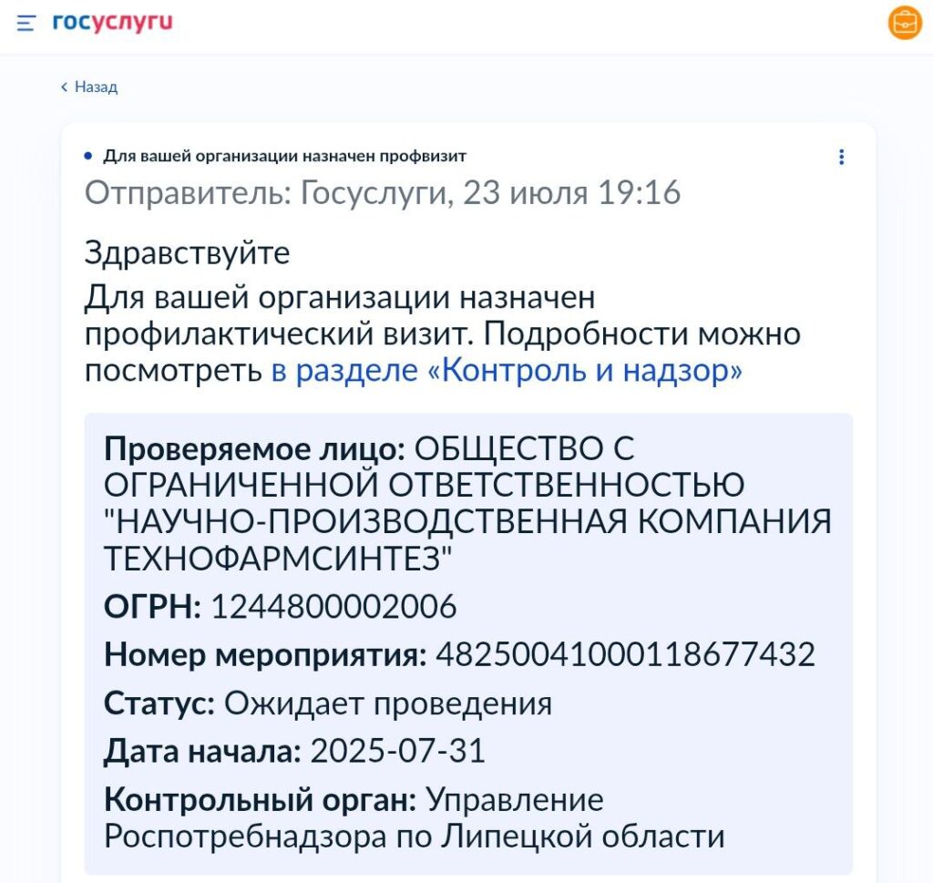По итогам планового мероприятия, проведённого Управлением Роспотребнадзора по Липецкой области, производственная площадка НАУЧНО-ПРОИЗВОДСТВЕННАЯ КОМПАНИЯ ТЕХНОФАРМСИНТЕЗ подтвердила соответствие санитарно-эпидемиологическим требованиям и стандартам безопасности! 🚀