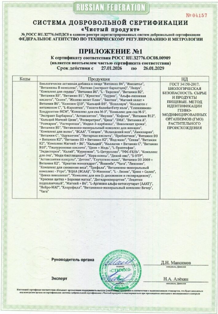 Сертификат распространяется на серийный выпуск всей линейки БАД, производимых НАУЧНО-ПРОИЗВОДСТВЕННОЙ КОМПАНИЕЙ ТЕХНОФАРМСИНТЕЗ, и действует с 27 января 2026 года по 26 января 2029 года.